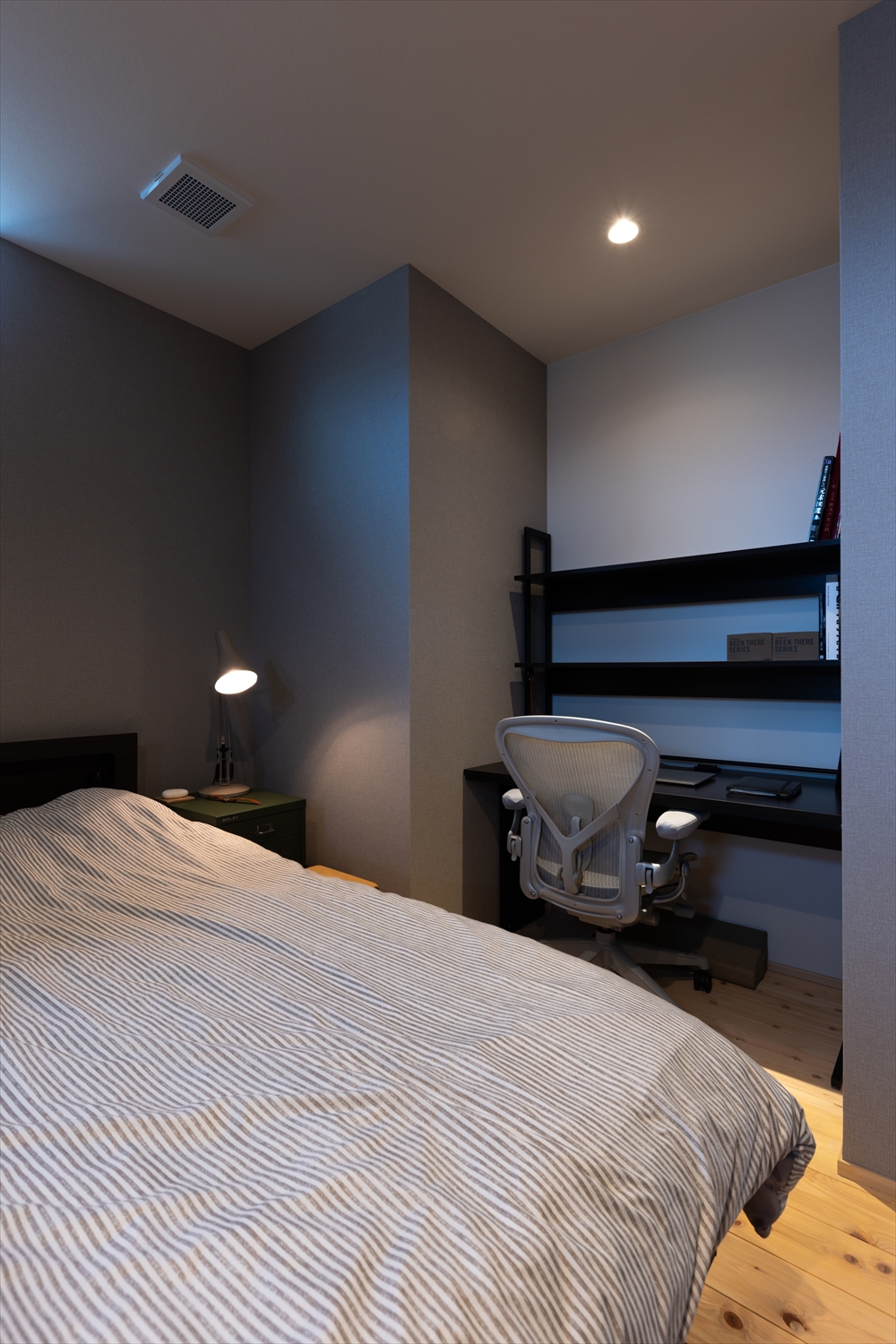仕事や趣味に集中できるご主人の書斎。アクセントクロスでカッコイイ空間に仕上げました。