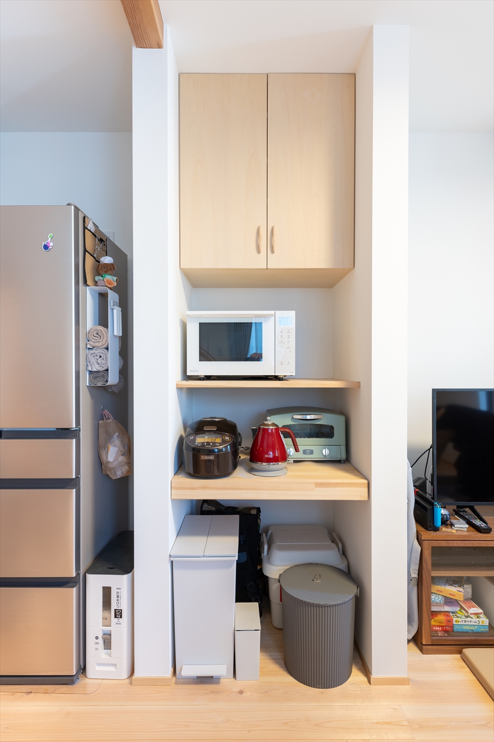 リビングを広く使うために壁付けキッチンを採用。壁面はマグネットがくっ つくので、魅せる収納を楽しめます。木のぬくもりたっぷりの吊戸棚は使いやすい高さに造り付けました。キッチン横にはオーブンレンジの台を付けたので、料理の動線がスムーズです。