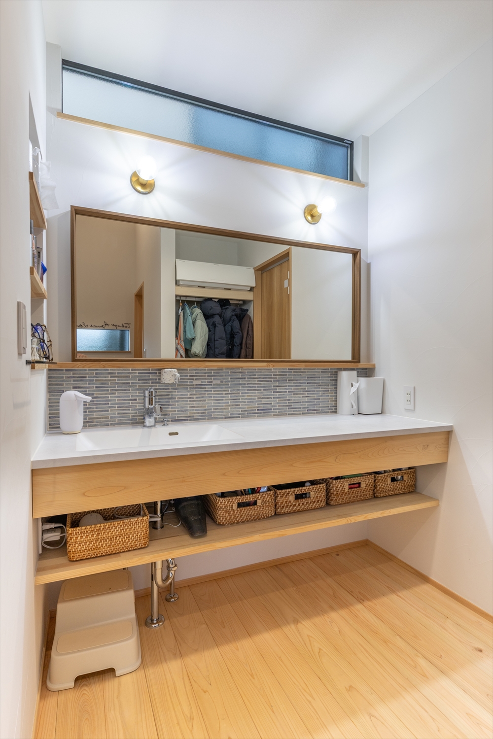 2人が並んで身支度できる幅広の造作洗面台。北側の窓から柔らかな光が差し込みます。棚には身支度用品の他パジャマや下着類も収納。脱衣室とは空間を分けたので気兼ねなく使えます。