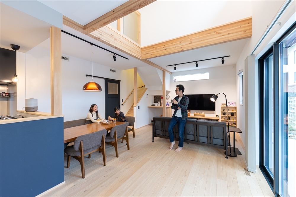 大きな吹き抜けに、存在感のある梁が目を引く、開放感と木のぬくもりに包まれた住まいです。LDKには調湿効果のある自然素材の塗り壁を採用。全館空調システムの効果と相まって、どこにいても快適に過ごせます。
