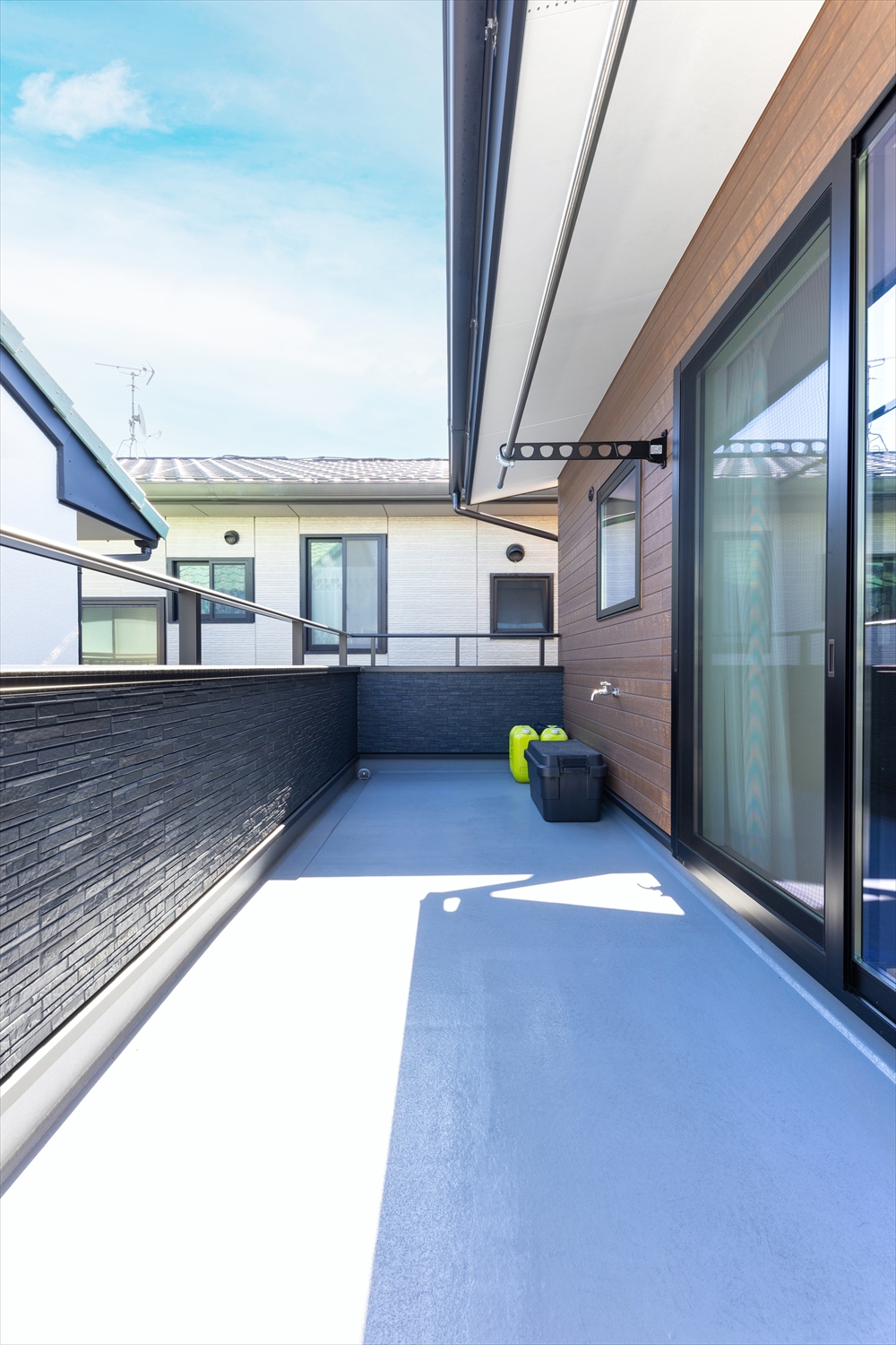ギングロのガルバリウムに柱や軒裏の木目が美しく映えます。リビングから出られる物干スペース。深い軒が突然の雨から洗濯物を守ります。
