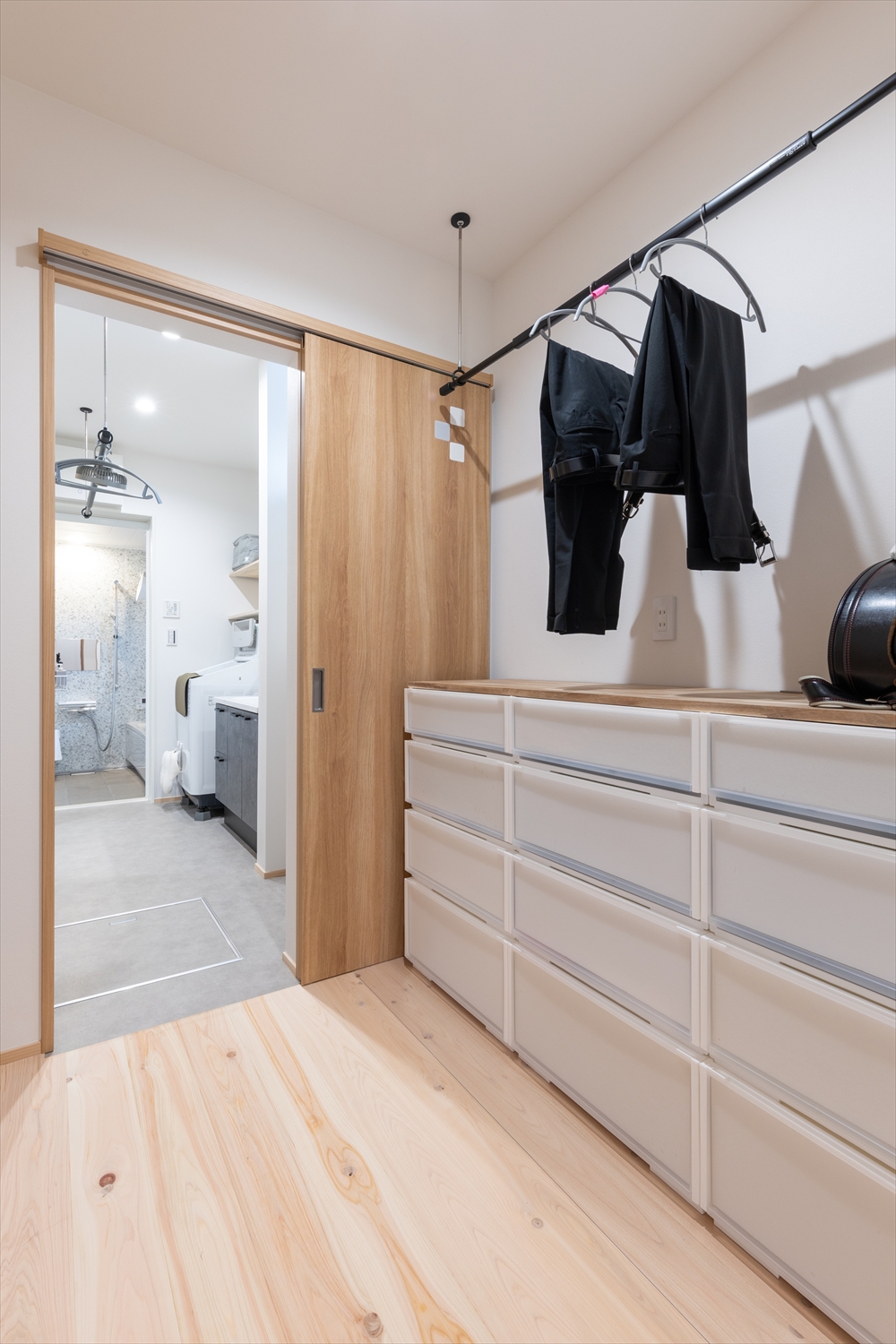 洗面脱衣室の隣にファミリークローゼットを配置。下着類も収納しているので、お風呂上がりのお着替えもスムーズです。