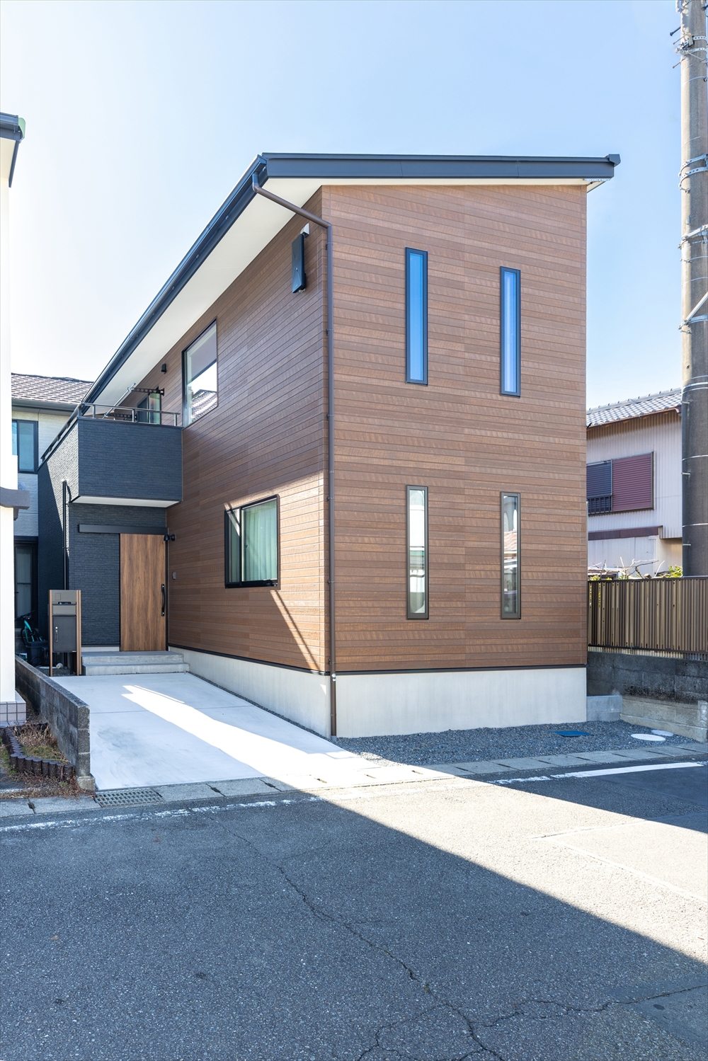 黒をベースに、緑の木目調でアクセントをつけた落ち着きのある外観。周囲の視線を気にせず、安心してお子さまを遊ばせられるよう、目隠しフェンスを設置しました。