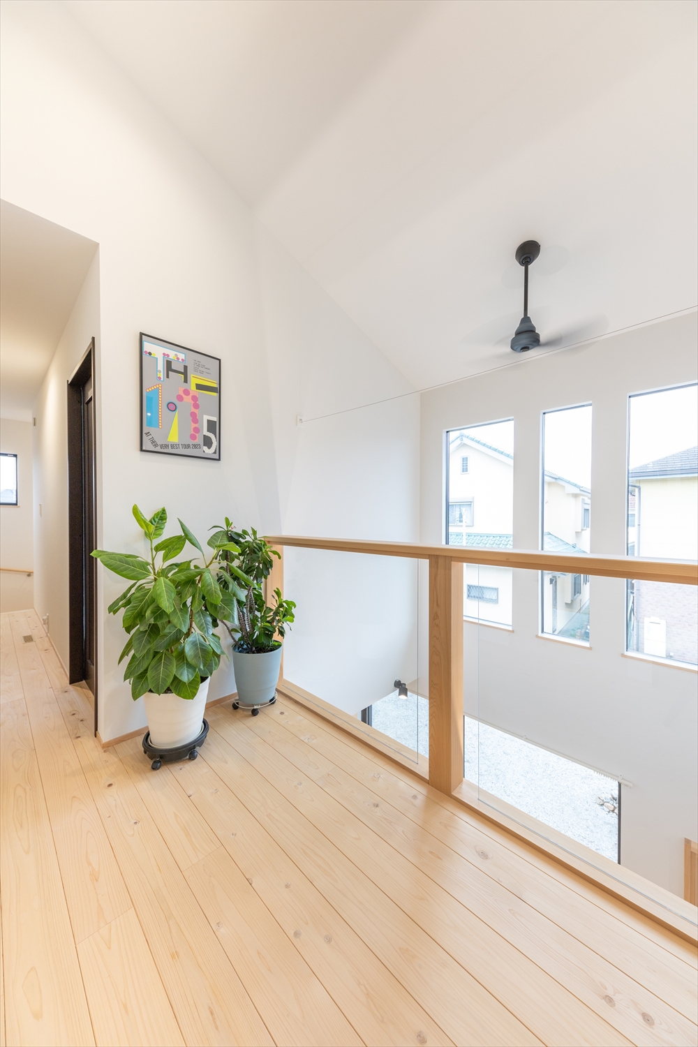 吹き抜けに面した2階ホールは、1階とのつながりを感じられるよう腰壁を強化ガラスにしました。布団干しにも使える物干しワイヤーを設置しています。