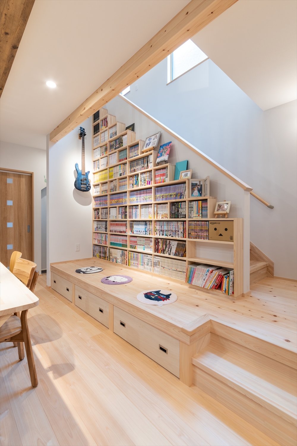 スキップフロアに本棚を造り付けました。ご主人の漫画コレクションが約1000 冊収まる大容量です。漫画を楽しむのはもちろん、お子さまへの絵本の読み聞かせにも活躍しています。下部の引き出しには、おむつや綿棒などを収納。お風呂上がりのお世話にも便利なスペースです。