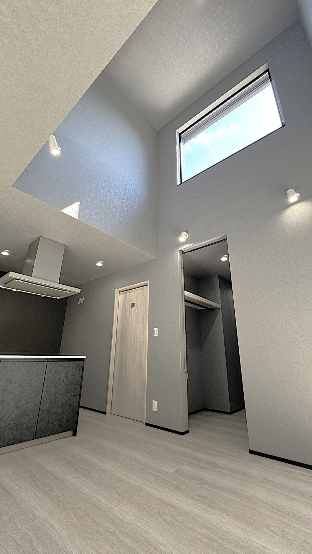 リビングは、無垢材の床がやさしく足元を包み込み、吹き抜けと折り下げ天井が空間に広がりとリズムをもたらす、贅沢で心地よい空間。洗練されたグレートーンでまとめられたインテリアは、モダンでありながらあたたかさも感じられ、まさに“くつろぎのラウンジ”と呼ぶにふさわしい仕上がりです。