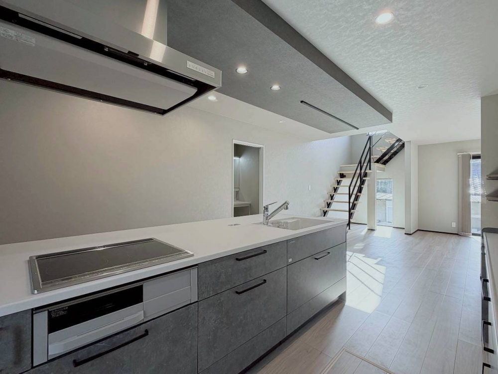 リビングスペースと調和した優しい木のパネルが美しい最新のアイランドキッチンは、ステンレス天板でレストランの様な高級感があり、毎日の家事を楽しくしてくれます。