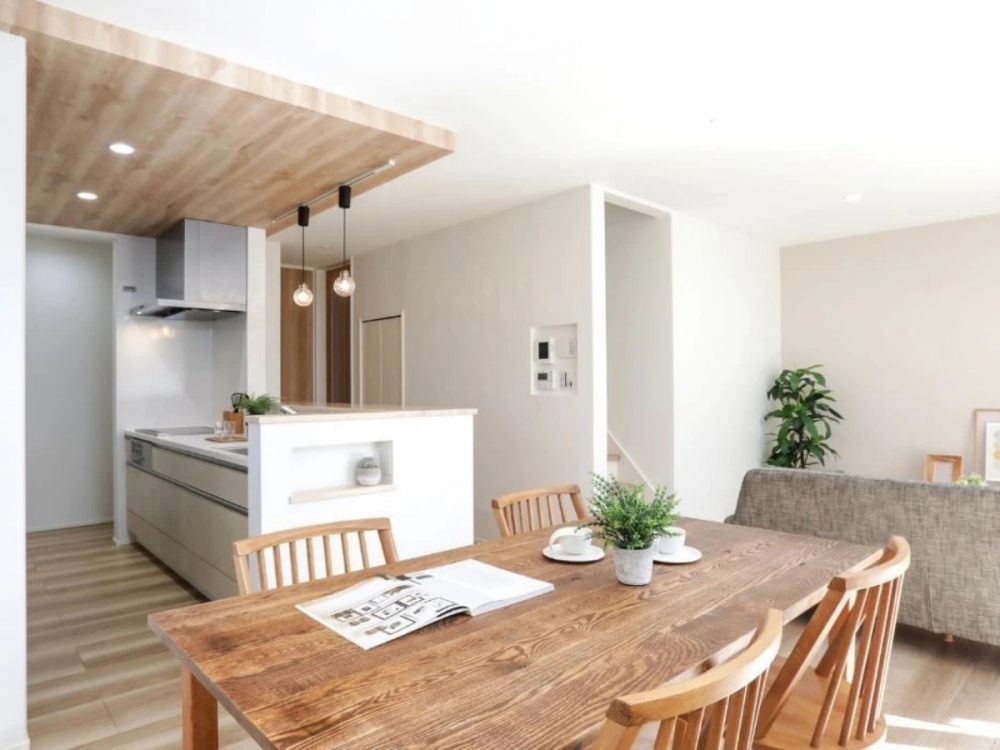 キッチン・ダイニング・リビングがひとつにつながるオープンなレイアウトで、家族の気配を感じながらそれぞれの時間を過ごせる設計に。木目の天井と床が空間全体に統一感と温かみをもたらし、ペンダントライトがやさしい光で食卓を彩ります。シンプルなインテリアにグリーンを添えた、明るく落ち着いた雰囲気のLDKは、暮らしに寄り添う心地よい住まいの中心です。