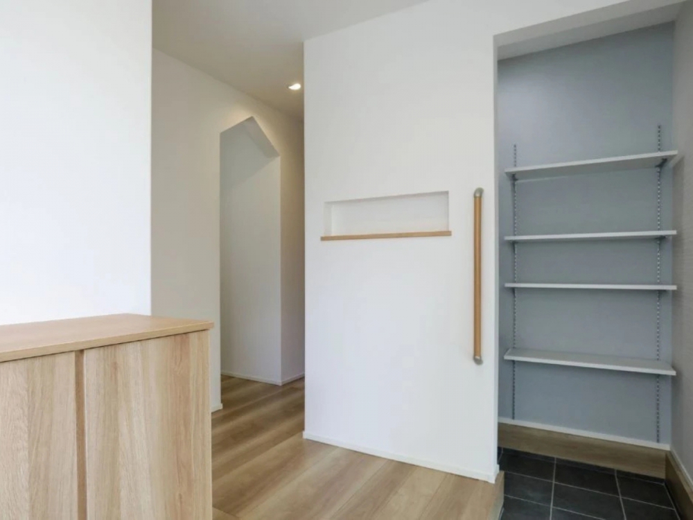 玄関に入るとまず目に飛び込んでくるのは、可愛らしいお家型のニッチ。お気に入りの雑貨や季節の小物を飾れば、訪れる人をあたたかく迎えてくれます。白を基調とした内装でまとめられた空間は、明るく清潔感があり、シンプルながらも洗練された印象に。毎日帰るのが楽しみになる、そんな玄関です。