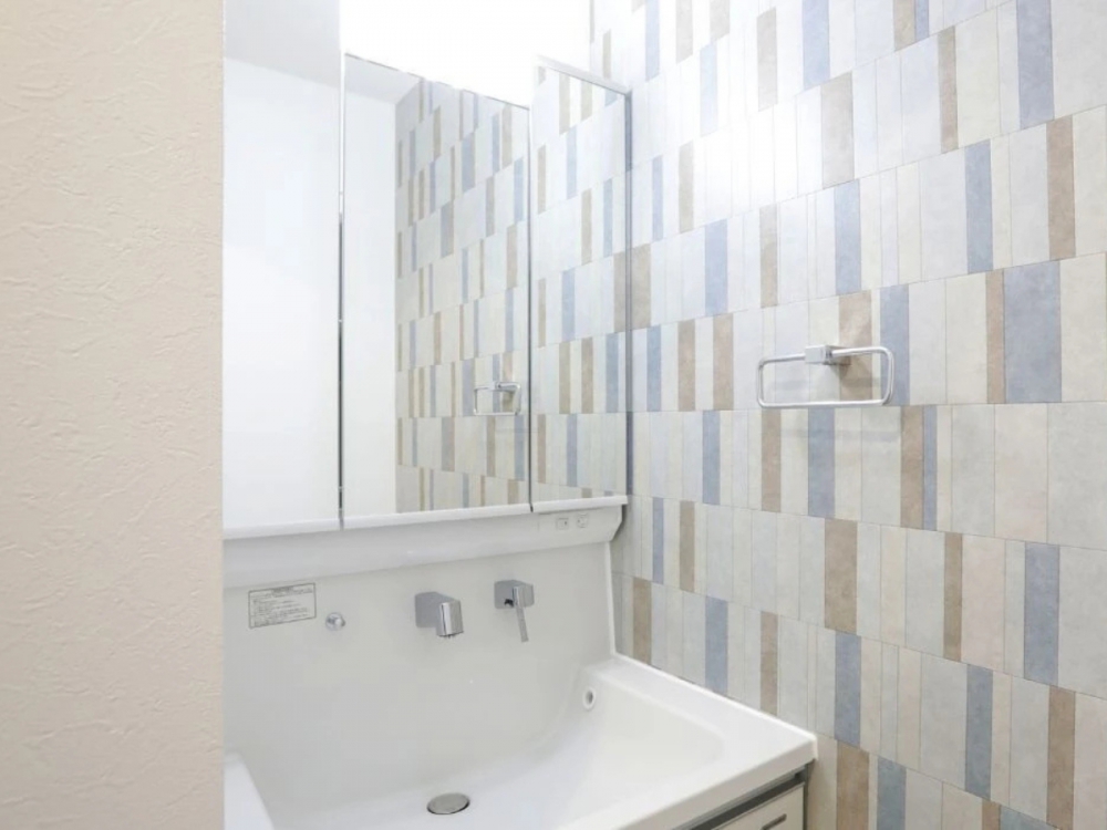 洗面スペースは、タイル調のカラフルなアクセントクロスが目を引く、明るくかわいらしい空間。朝の身支度も気分が上がるようなデザインで、毎日をちょっと楽しくしてくれます。デザイン性と機能性を兼ね備えた、家族みんなにやさしい洗面です。