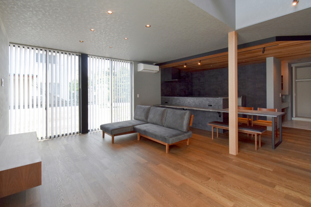 天井や床のナチュラルな木の質感に、キッチン周りのダークグレーやブラックが空間をグッと引き締めます。大きな窓から光がたっぷり入り、暗くならず開放感あふれるリビングです。