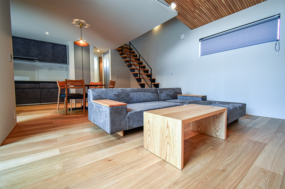無垢材のフローリングに、空間のアクセントとなるアイアン手すりの階段が目を惹くLDK。重厚感のあるソファやダークトーンのキッチンを合わせることで空間全体がぐっと引き締まり、洗練されたホテルライクな雰囲気を演出しています。