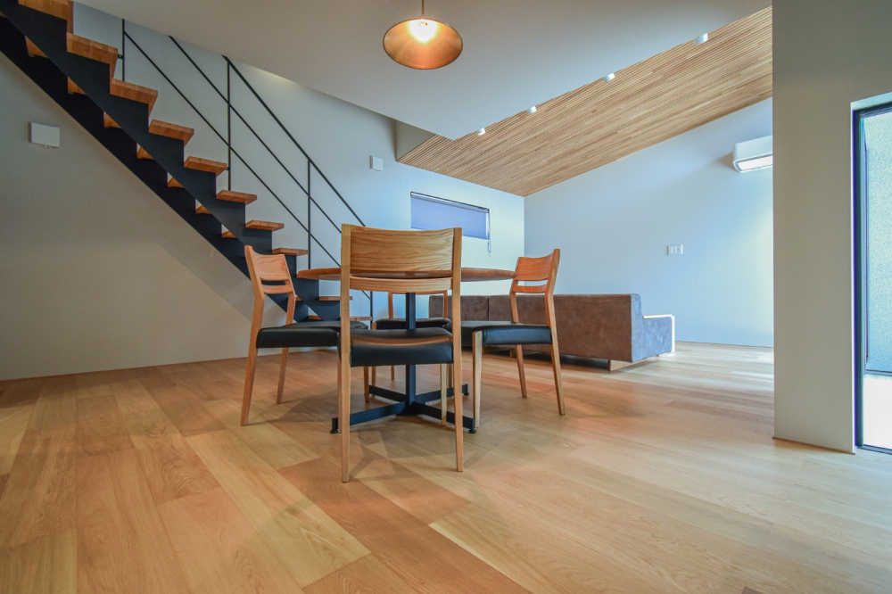 勾配天井による縦の広がりが圧倒的な開放感を演出。床と天井に無垢材をふんだんに使い、木の香りに包まれるような温かみのあるLDKです。