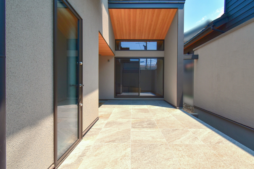 外からの視線をしっかりと遮る壁を設けた、プライベート感あふれるタイル張りの中庭。軒天にも木目をあしらうことで室内との美しい連続性が生まれ、リビングの延長として多目的に活用できるアウトドアリビングです。