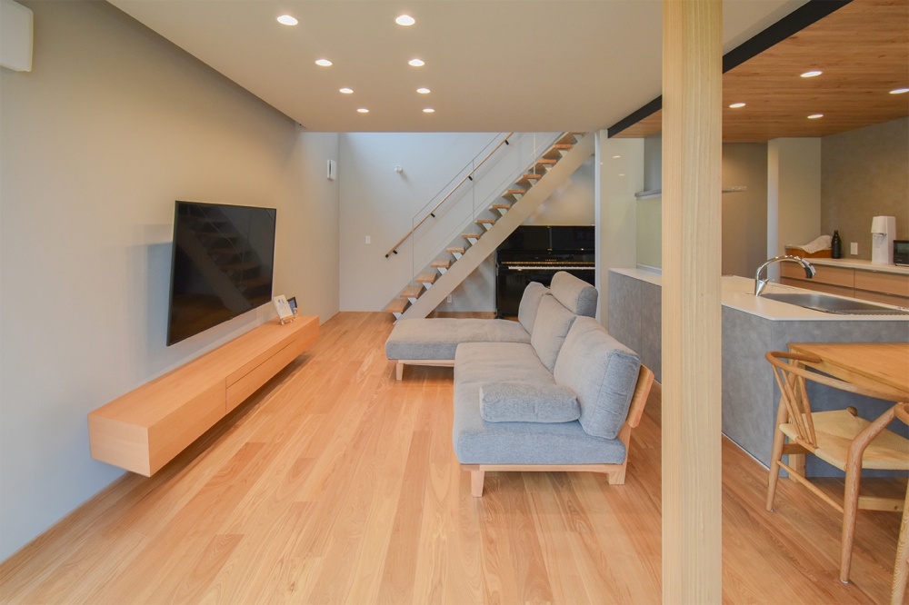 リビングには、床から浮かせた木製テレビボードと壁掛けテレビを採用しました。足元に空間ができることでお部屋がより広く見え、下をお掃除ロボットがスイスイ通れるのも嬉しいポイント。奥の階段スペースへと視線が抜ける、ゆったりとくつろげる開放的なリビングです。