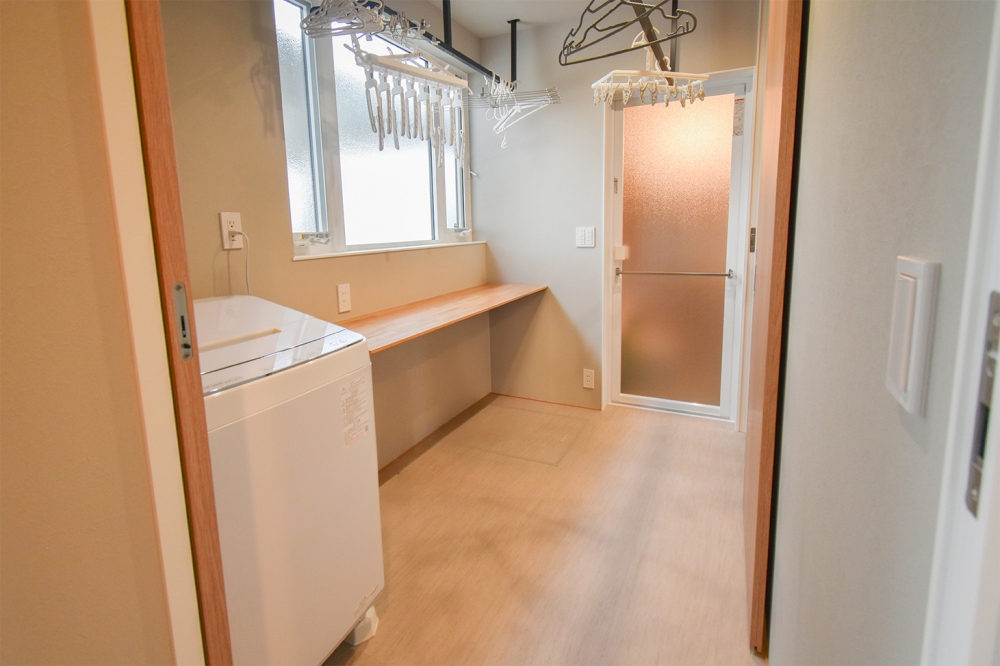 天候や花粉を気にせず、洗濯物をたっぷり干せる室内干し用のサンルーム。壁際には幅広の木製カウンターを造作しているため、乾いたお洋服をその場でサッと畳んだり、アイロンを掛けたりと、あちこち移動することなく洗濯の家事がこの空間だけで完結します。