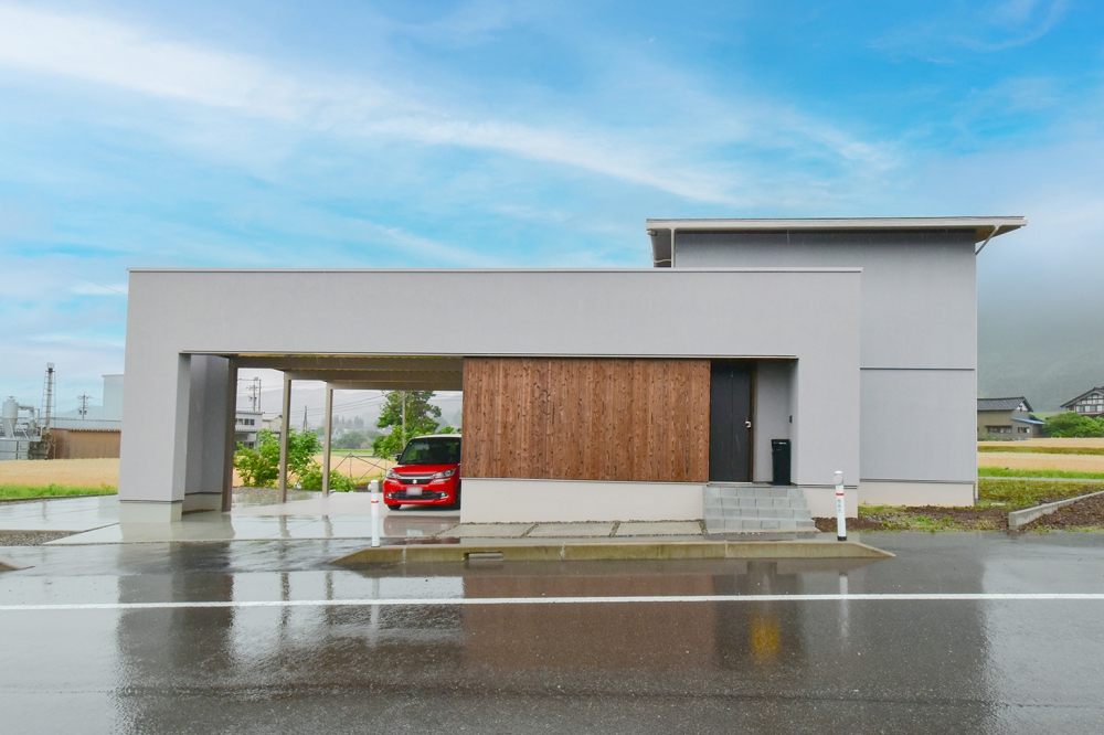 室内にも使われている「淡いグリーン」を外壁のアクセントカラーに採用しました。直線的でスタイリッシュな屋根の形が目を惹きます。雪や雨の日でも車の乗り降りがしやすい、広々としたカーポートも完備しています。
