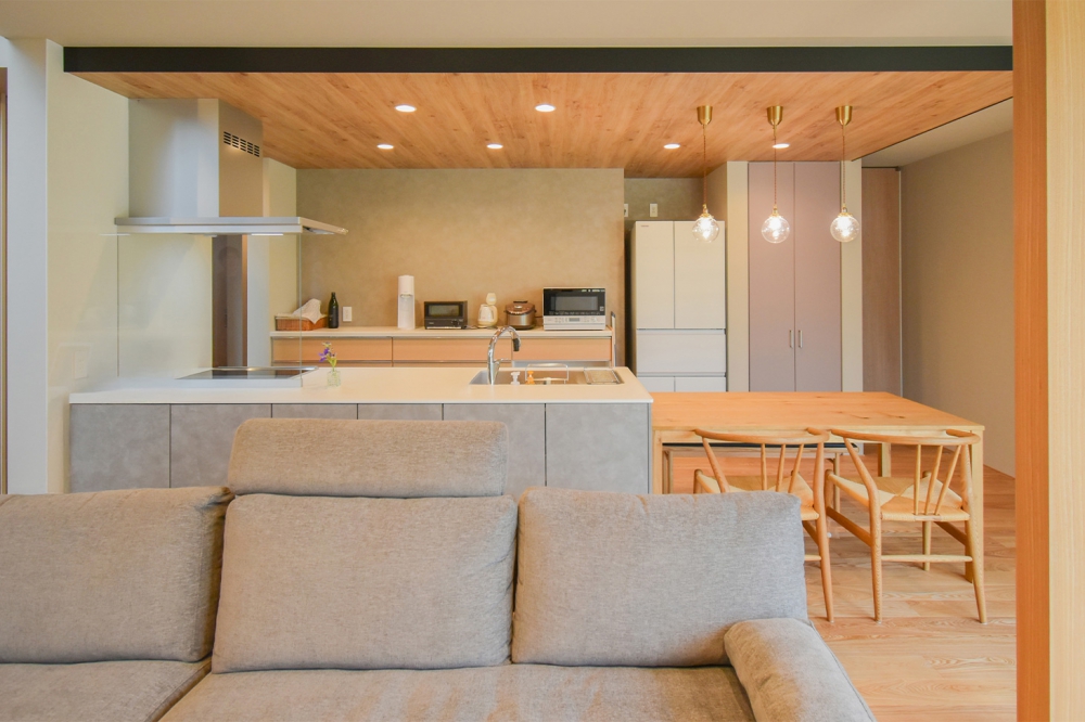 キッチン側はあえて天井高を抑え、美しい板張りに仕上げました。リビングとの空間にメリハリが生まれ、落ち着いて食事ができるエリアになっています。