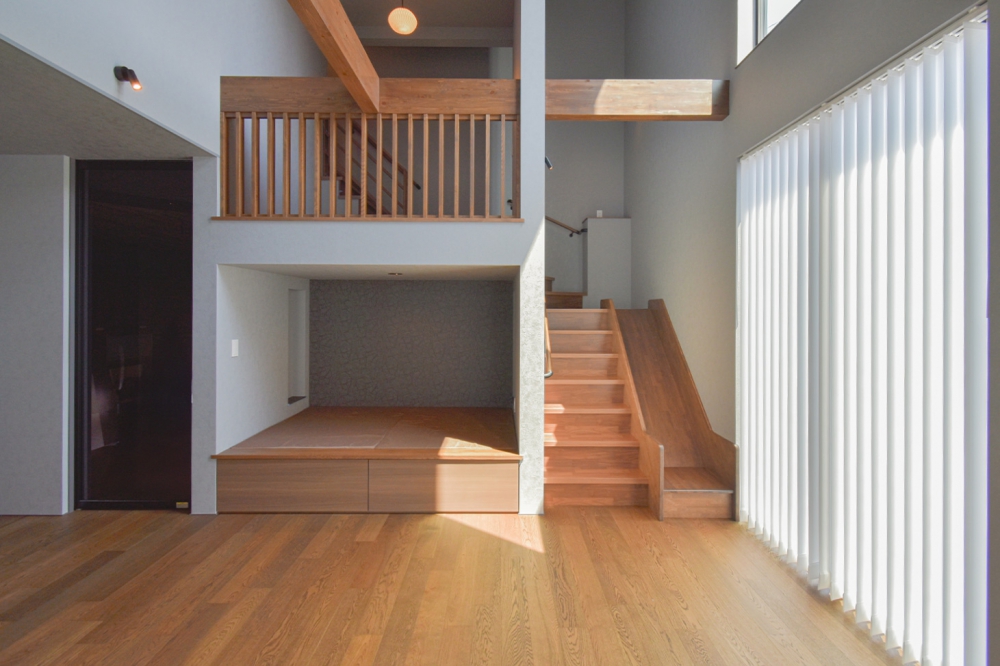 吹抜けの大きな窓から、1階の隅々までしっかり自然光が届きます。視線が抜けるオープンな木製の手すりを採用することで、空間がより広く感じられる工夫も。1階にいる家族の気配を感じやすく、家全体が明るくつながる設計です。