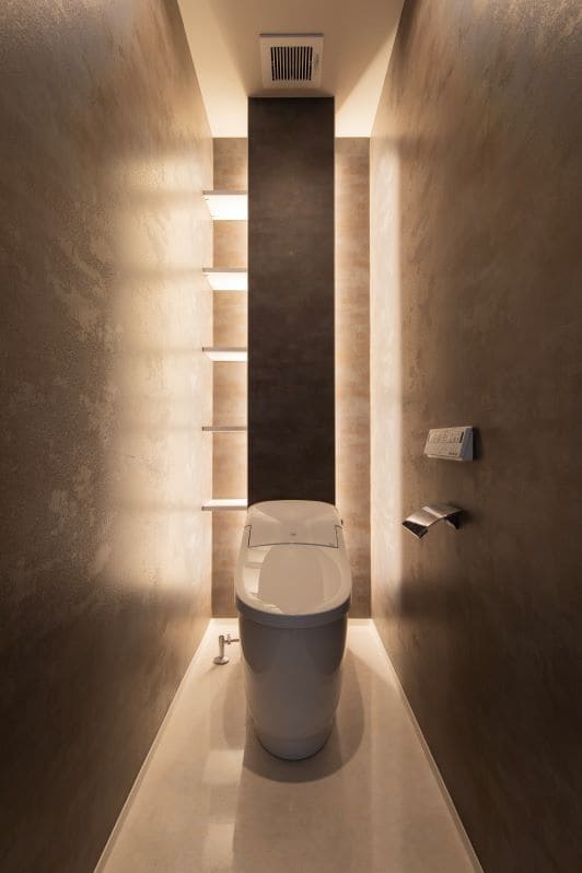 間接照明の柔らかな光が壁を照らし、まるでホテルのような上質なトイレ空間を演出。生活感をなくした、洗練されたデザインにこだわりました。