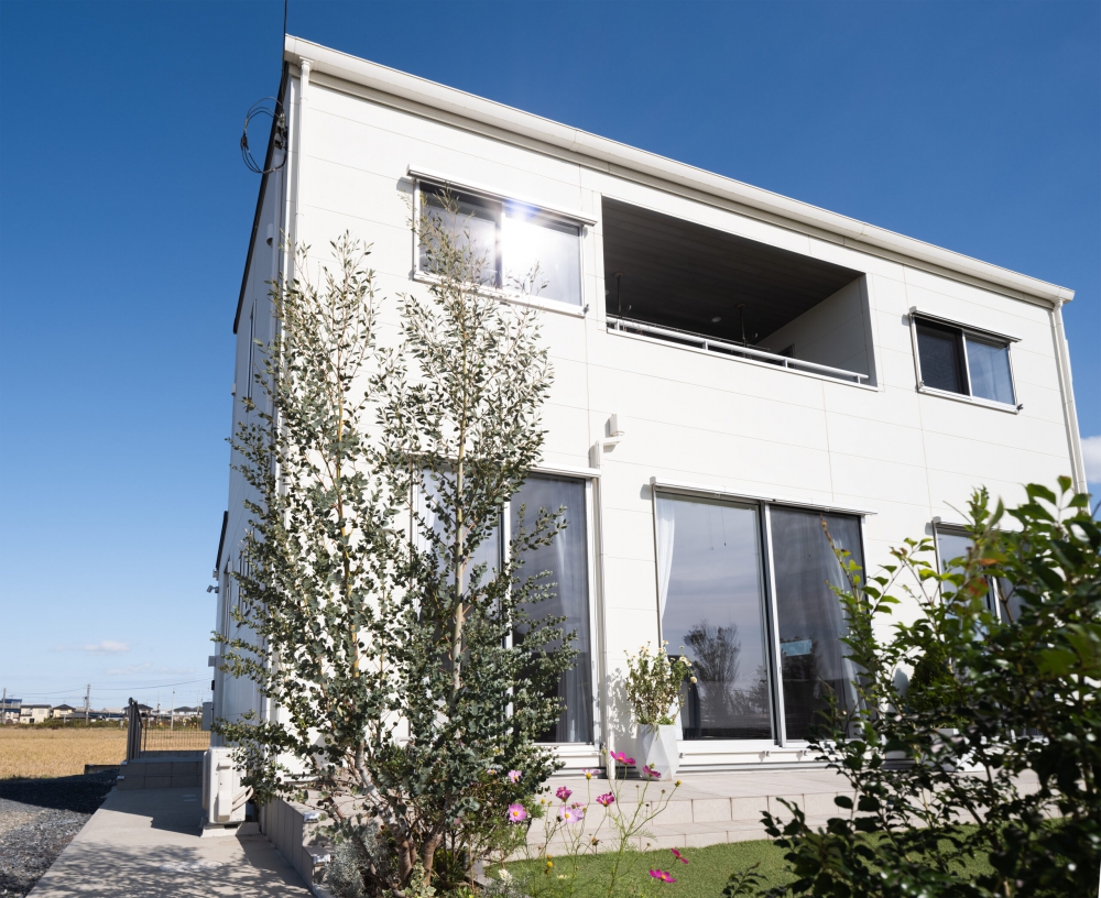 デザインは極力シンプルに、そして安全面を考慮し、車を停めてからスムーズに移動できるようスロープを設けた住まいを希望されました。また、日光浴ができる場所をつくりたいという想いから、2階にはルーフバルコニーをご提案。1階部分にはタイルデッキを設け、BBQを楽しめるスペースとしています。お庭は、お子さんが野球の練習をできるよう、広さをしっかり確保しました。