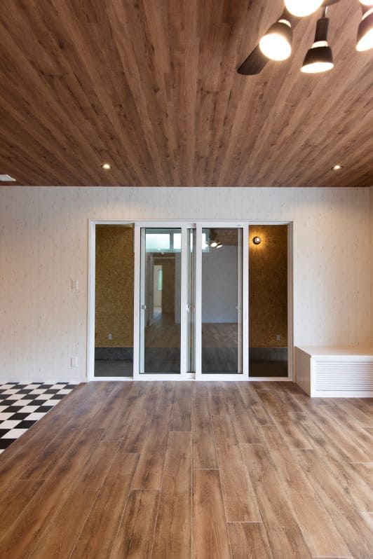 木目調の天井と温かみのあるフローリングを採用した22帖のLDK。大開口の窓の向こうはバイクガレージになっており、愛車をまるでアートのように眺めながらくつろげる空間です。