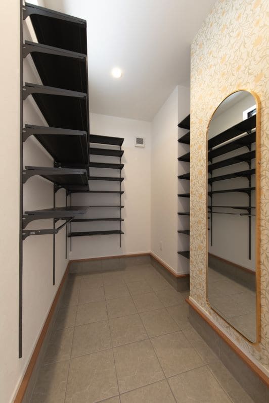 玄関横のシューズクロークは、アクセントクロスに姿見を取り付けて、空間のアクセントに。大型の荷物も楽に収納できるゆとりある広さで、急な来客時にも玄関をいつもきれいに保てます。
