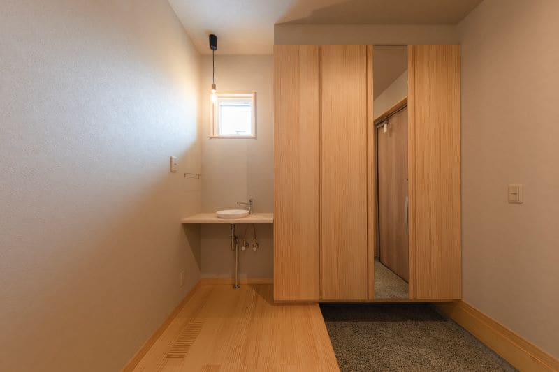 アウター類も収納できる、大容量のシューズクロークを備えた玄関。すぐそばに洗面所を配置し、帰宅後の手洗いや身支度がスムーズに行える動線を取り入れました。
