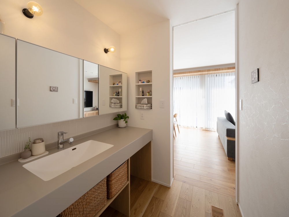 お施主様のこだわりが詰まった造作洗面台。サンワカンパニーの三面鏡とアイカ工業のカウンターを採用し、デザイン性と使い勝手の両方を叶えました。ランドリースペースと洗面台を分離させることで、より快適な空間を実現しています。