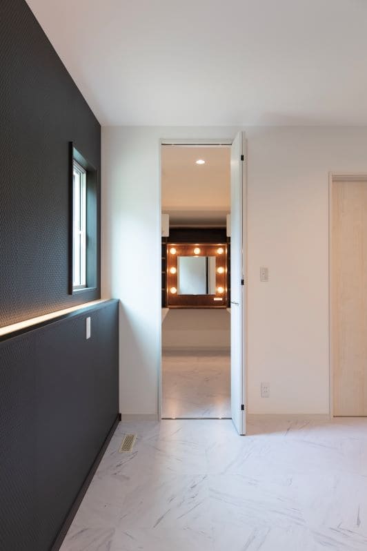 寝室に隣接するウォークインクローゼット(WIC)の一角に、特別なメイクスペースを設けました。 お施主様のご要望を形にした造作のドレッサーは「女優ミラー」をイメージ。窓がない場所でも、最適な位置に設置した照明が顔全体を明るく照らし、メイクやヘアセットがしやすいよう細部までこだわっています。