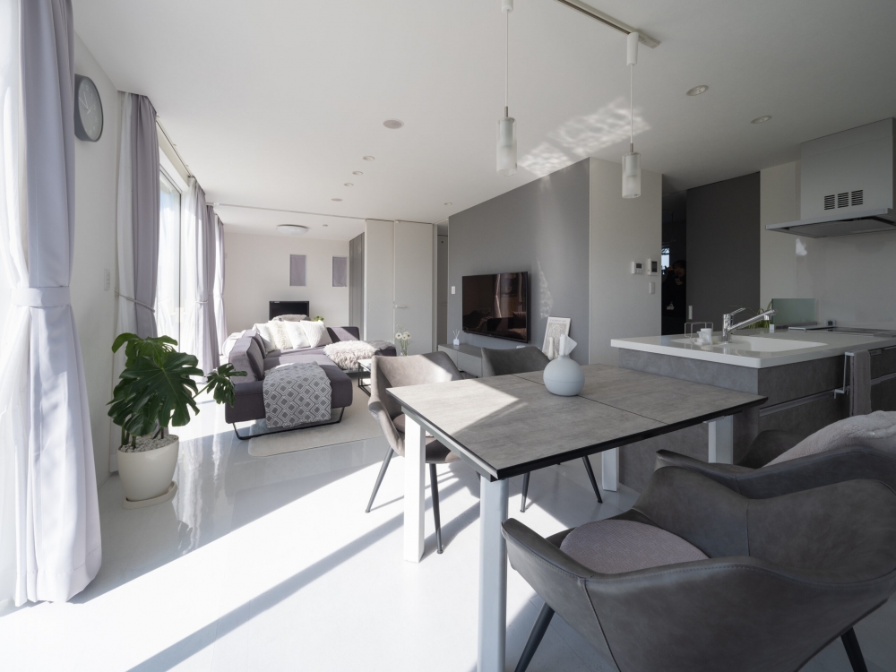真っ白な空間にグレーを効かせた、すっきりとしたインテリアのLDK。リビングとフラットにつながる洋室を隣接させ、ライフステージの変化に合わせて柔軟に使える間取りとしています。