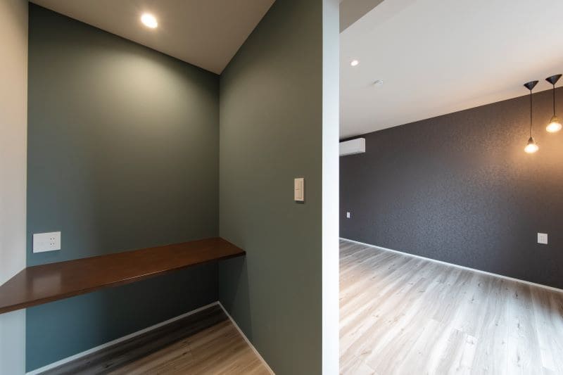 階段下の空間を有効活用したこちらの書斎コーナーは、ホールから一段下がることで圧迫感を軽減し、まるで秘密基地のような落ち着いた雰囲気を生み出しています。ご主人の集中作業スペースとして、心地よく仕事や趣味に没頭できる、特別な場所が完成しました。