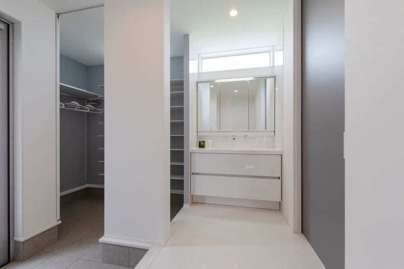 洗面脱衣室には壁一面を使った大きなクローゼットを完備。