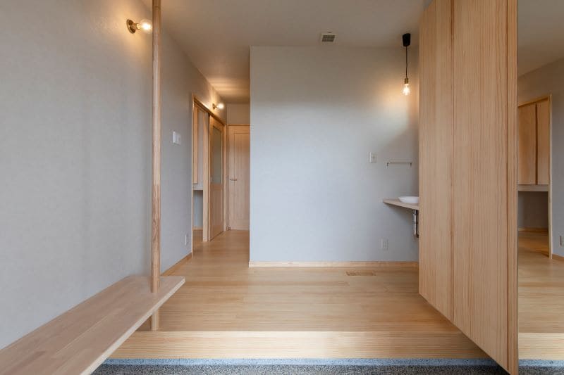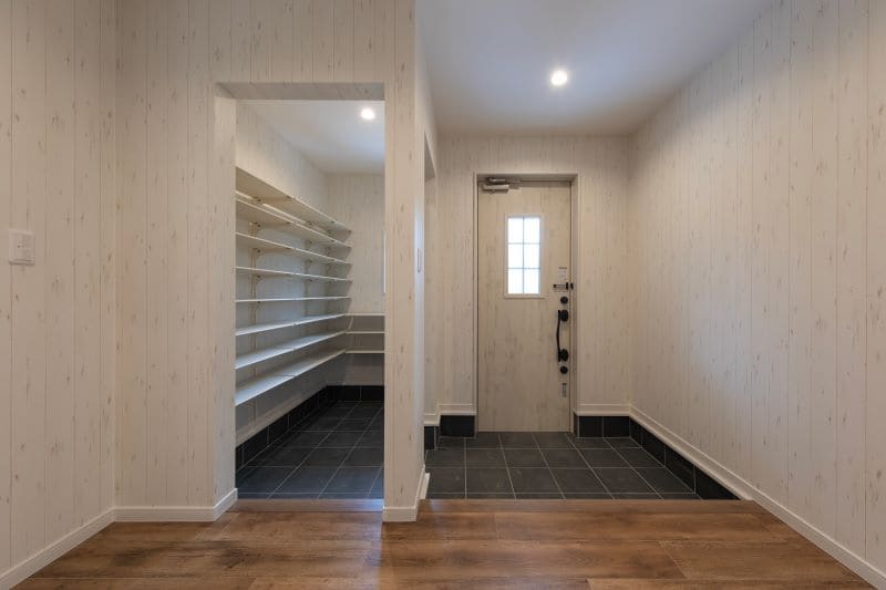 木の温もりを感じさせる木目調の壁に、土間のタイルがアクセントになったエントランス。家族用とゲスト用を分けた動線を確保し、いつでもすっきりとした印象を保てます。