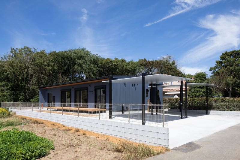 お客様のバイクライフを堪能できるインナーガレージ付きの平屋をご提案。無駄を削ぎ落とした箱型で、スタイリッシュな外観です。