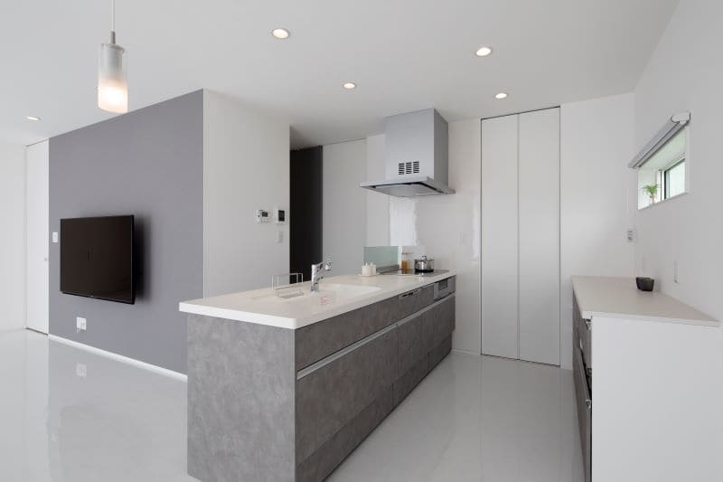 グレーとホワイトの組み合わせが、やさしく洗練された印象を演出しています。キッチン奥のスリット窓からは明るい自然光と外の景色が届き、調理中も開放的で心地よい時間が流れます。テラコッタ調のフロアタイルが温かみを添える、毎日の料理が楽しくなるキッチンです。