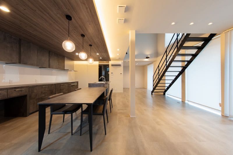 お客様はスタイリッシュなデザインを追求され、寄棟屋根やハイドア、天井のラインにこだわった美しい住まいを実現しました。随所に木質素材を取り入れ、温かみも両立。