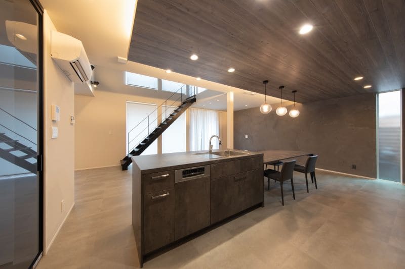 グレーを基調としたシンプルモダンな内装は、グラフテクトのキッチンに合わせて選定。モルタル調の床材や壁など、ホテルライクな大空間を演出しました。