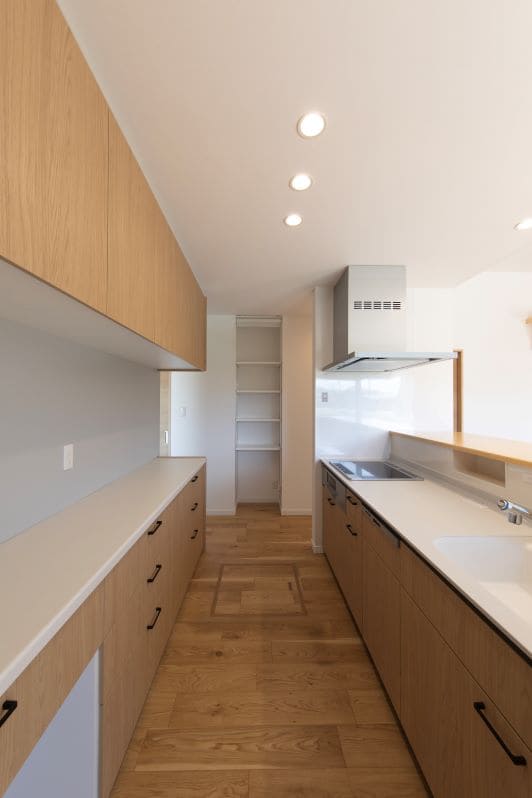 背面収納をはじめ、たっぷりの収納を備えたキッチン。物が散らからず、いつでもすっきりとした空間を保てます。 このキッチンの大きな特徴は、ガレージと隣接している点です。買い出し品の搬入や、趣味の道具の手入れなど、家事動線と趣味の動線がスムーズに繋がるよう配慮し、利便性を高めました。
