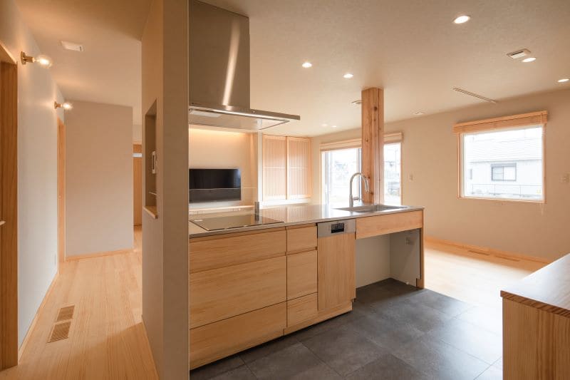 アイランドのように回遊できるペニンシュラキッチンを採用。料理中も家族との会話が途切れず、配膳・片付けもスムーズな家事ラク設計です。LIXILの木目調のキッチンが、空間にアクセントを加えます。