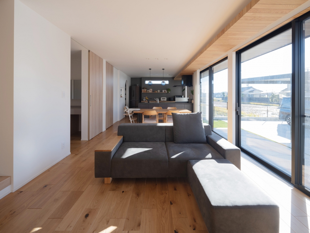 実家の農地に「平屋ベースで1階完結、外と繋がる明るいLDK」を望んだT様邸。南向き設計で日射取得を最大化し、間口を広げ開放的なLDKを実現しました。家事楽動線やカスタマイズ洗面、メンテナンス性の高い外壁など、T様のこだわりが随所に詰まった快適な住まいが完成しました。