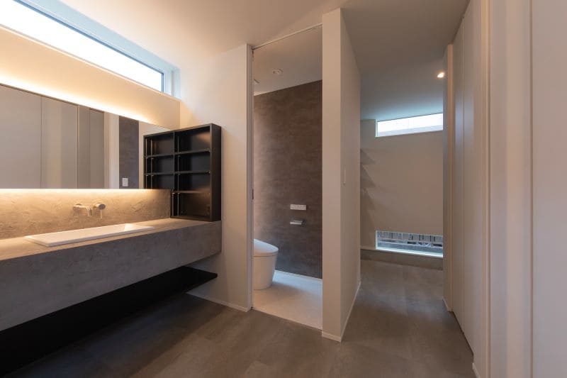 落ち着いたグレーの壁が、心を落ち着かせるトイレ空間を演出。カウンターを設けることで、機能性とデザイン性を両立させました。