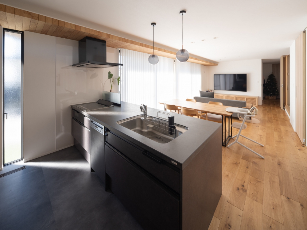 LIXIL「リシェル」のキッチンを、リビングを見渡せる場所に配置しました。料理をしながらでも家族の様子を感じられる、あたたかい空間です。床にはフロアタイルを使用し、見た目の美しさと掃除のしやすさを両立させた、機能的なキッチン空間に仕上げています。