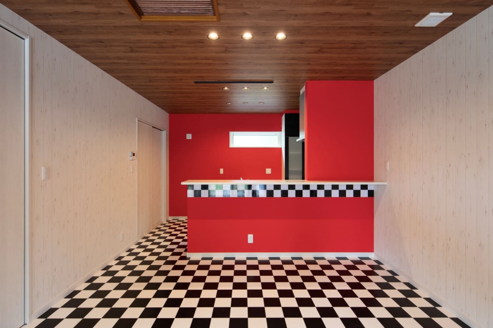 まるでオールドアメリカンなダイナーにいるような、遊び心あふれるキッチン。床のチェッカーフラッグ柄と鮮やかな赤壁が空間の主役です。この個性的なキッチンなら、毎日の料理の時間もきっと楽しくなることでしょう。