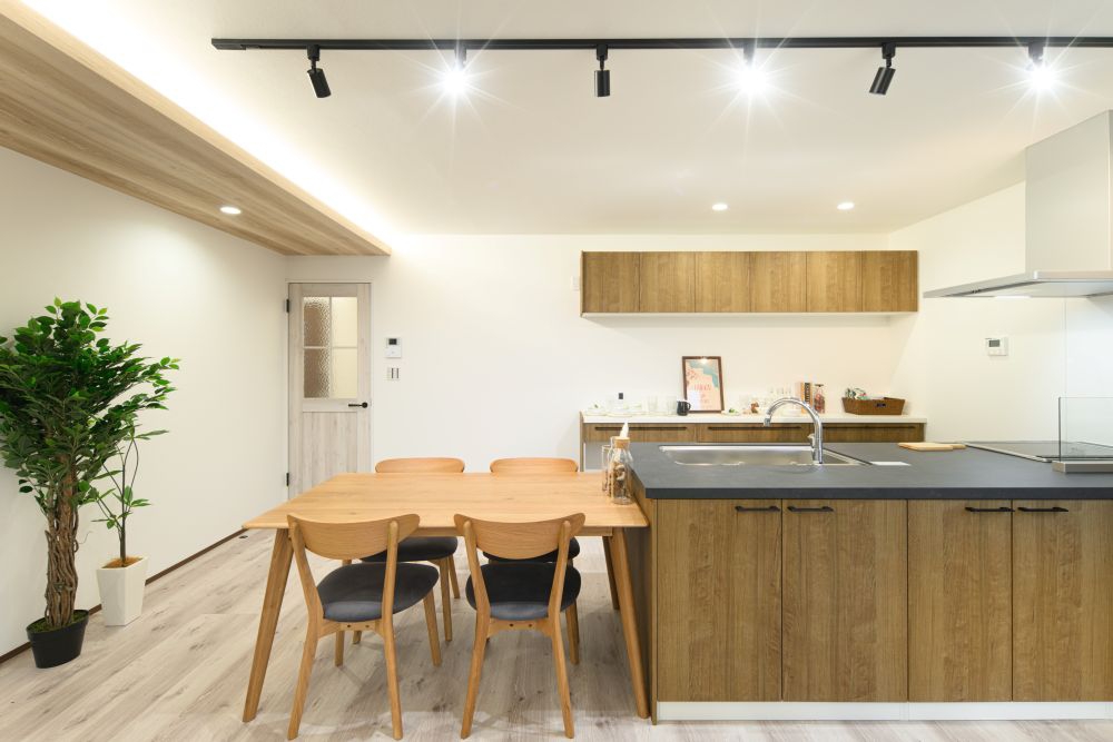 ライトブラウンの床と天井が、家族の集う場所を優しく彩ります。