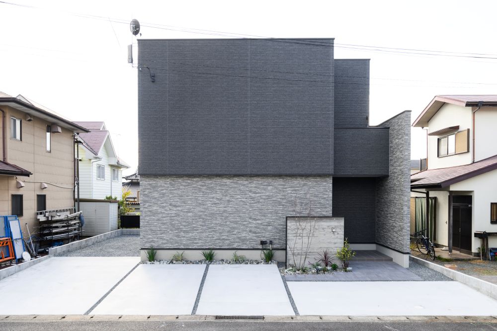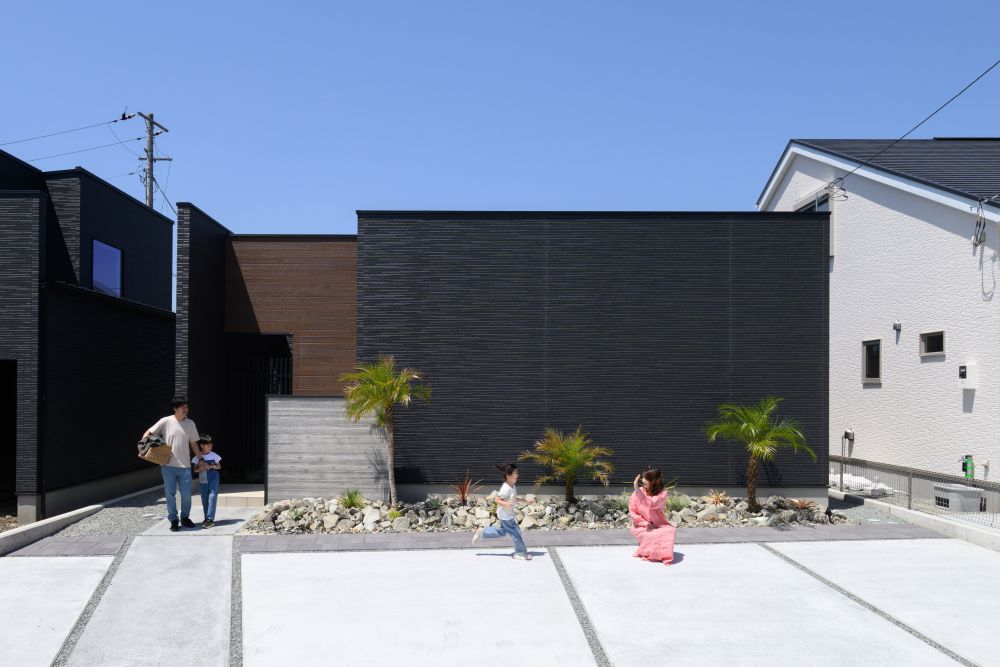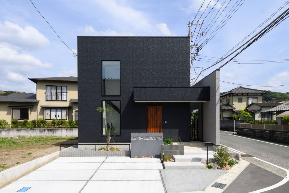 窓を隠しプライバシーを守る、圧倒的な存在感の黒い外壁。