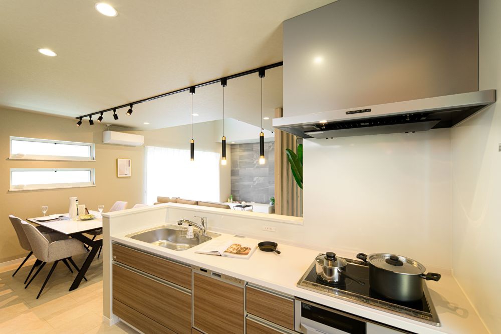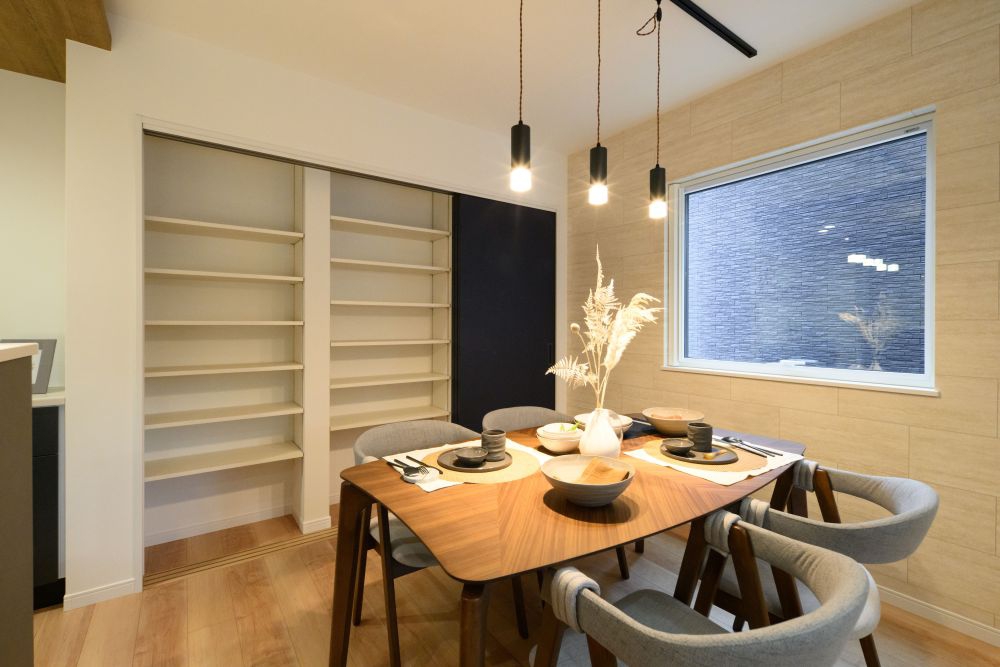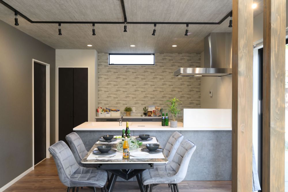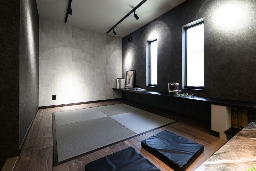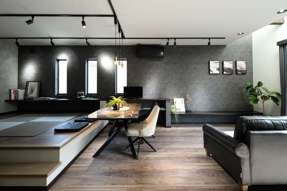 グレーやブラックを基調とした、重厚感あふれるモノトーンの外観と内装が特徴です。バーのようなキッチンカウンターや、小上がりの空間、ホテルライクな造作洗面台など、大人のこだわりを詰め込みました。計算された間接照明が、夜の時間をより美しく豊かに彩ります。