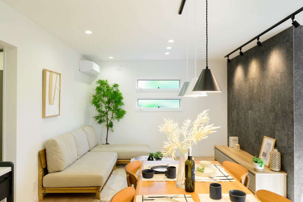 黒のアクセント壁が空間を引き締める、洗練されたLDK。