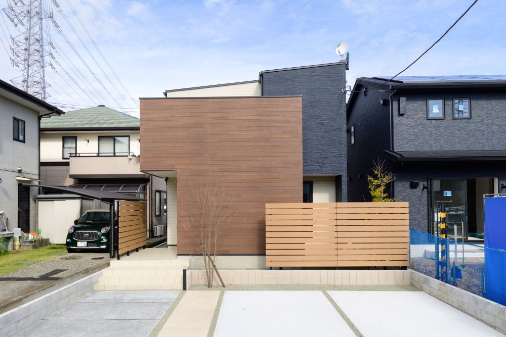 和の格子を彷彿とさせるウッドデザインが光る、モダンな佇まい。