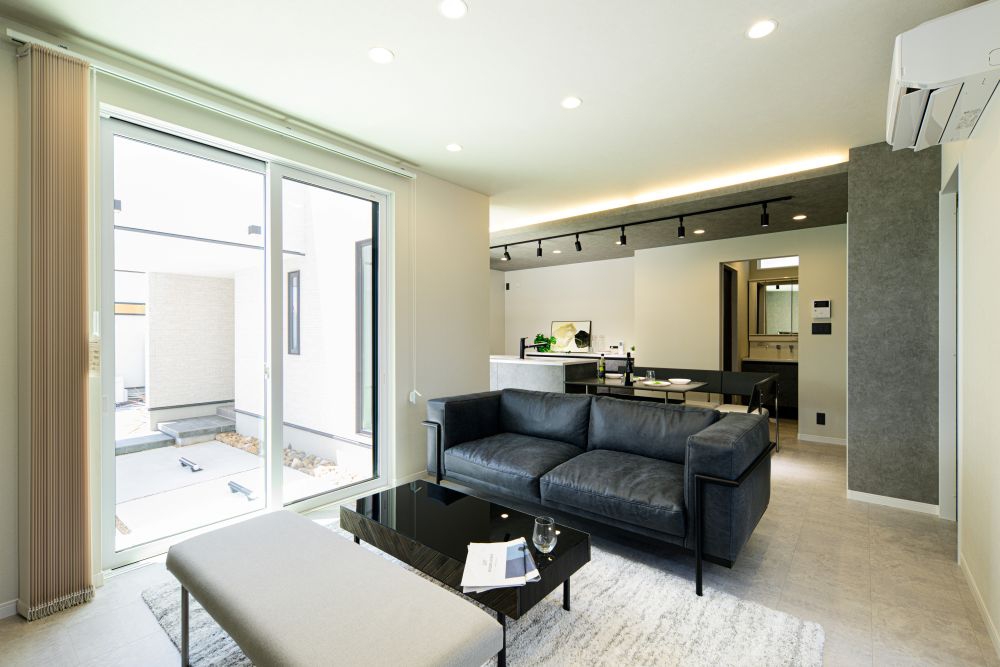 シックな色調で統一された、広々とした開放的なリビング空間。